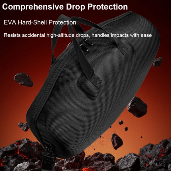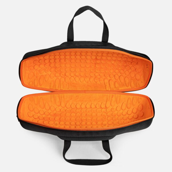Ela é construída com material EVA absorvente de choque, forro macio e acabamento em malha durável, oferecendo proteção abrangente contra quedas e impactos durante o transporte.