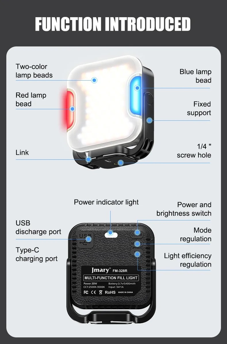 Uma luz de preenchimento LED portátil multifuncional, projetada tanto para camping quanto para produção de vídeo e fotografia