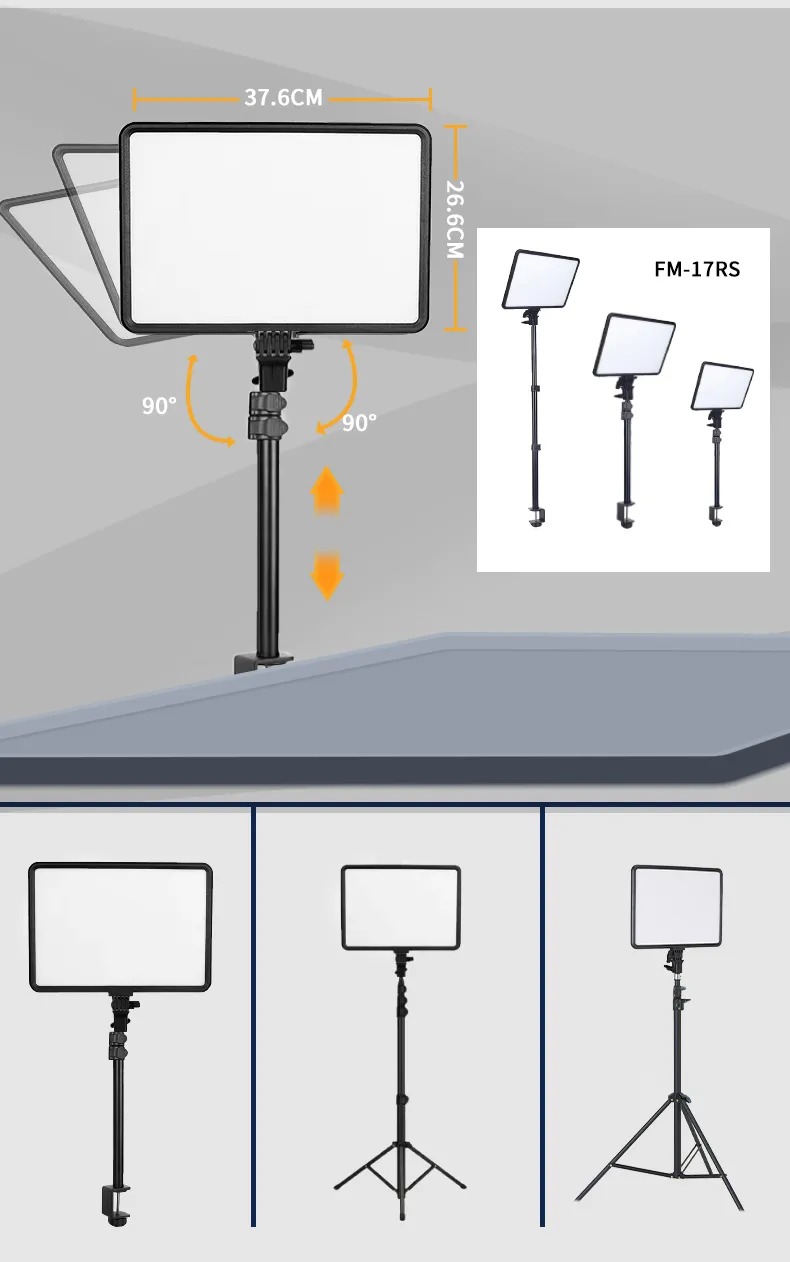• Iluminação suave e uniforme: O FM 17RS utiliza um painel grande com inúmeros LEDs para produzir uma luz suave que reduz as sombras, ideal para obter uma aparência natural e profissional.